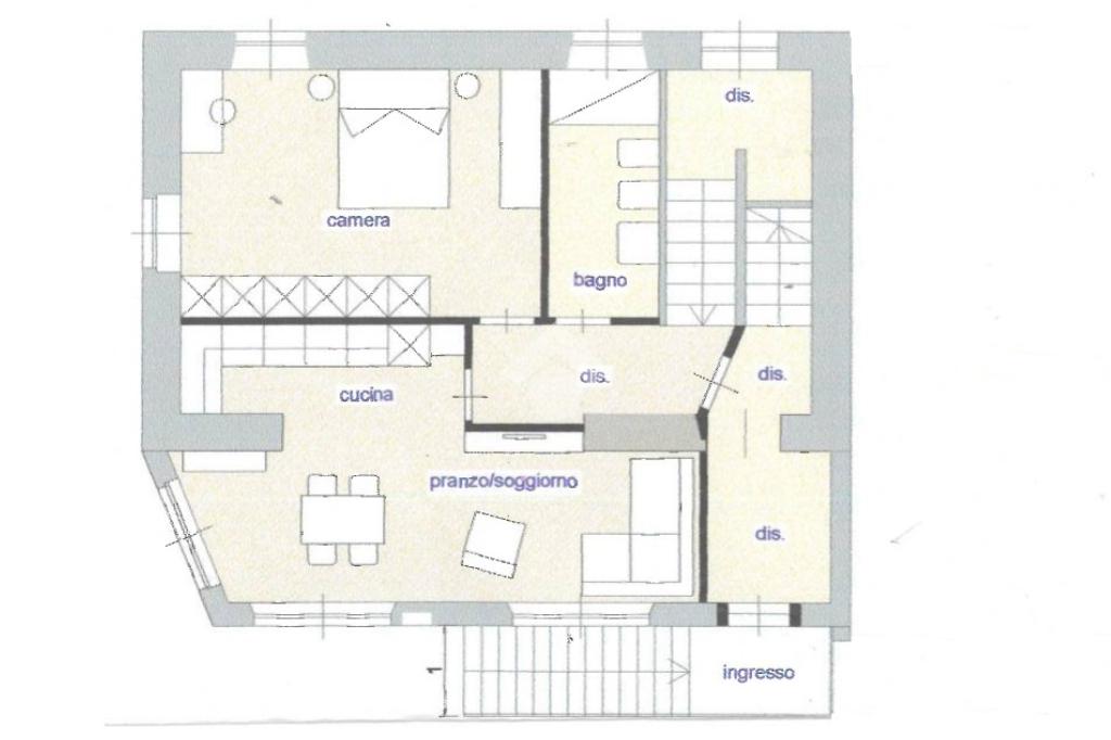 Qui troviamo un’accogliente zona giorno living con cucina e soggiorno/pranzo in ambiente aperto, valorizzato da tre grandi finestre che garantiscono luminosità naturale per tutta la giornata. La camera da letto, anch’essa luminosa grazie alle due finestre, offre uno spazio intimo e ben distribuito, mentre il bagno è rifinito con moderno piatto doccia.