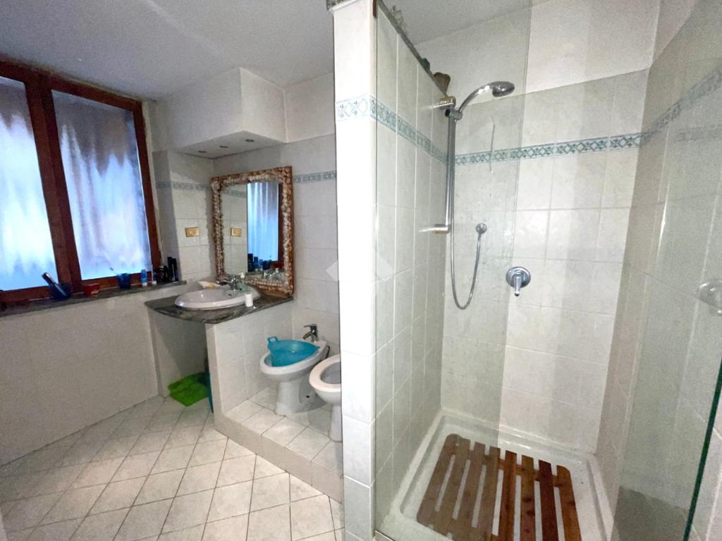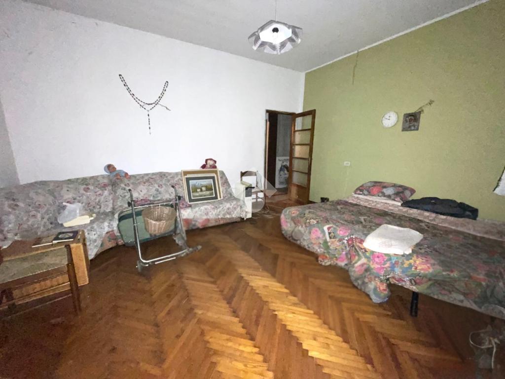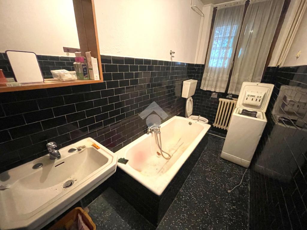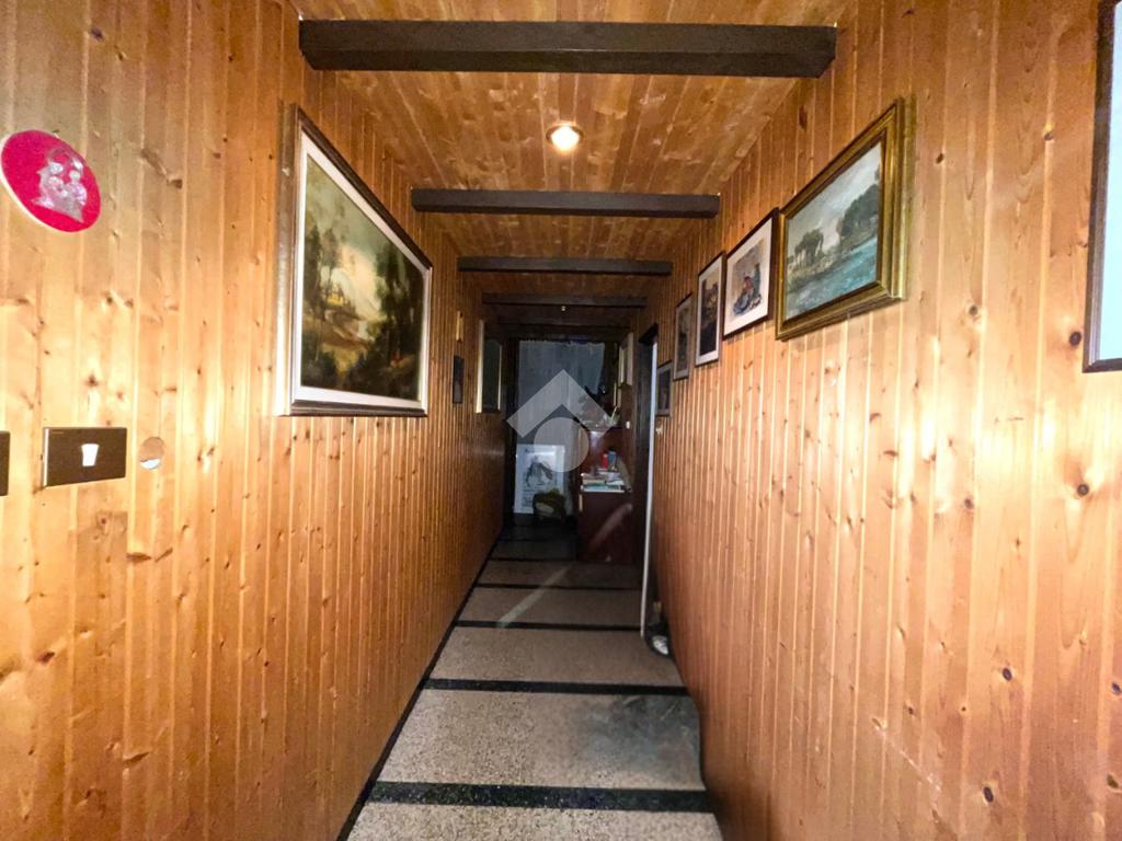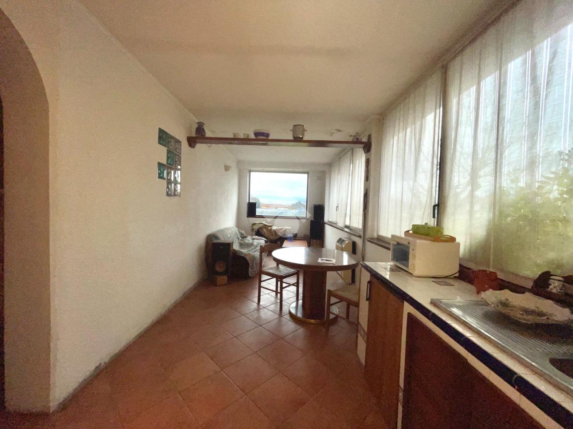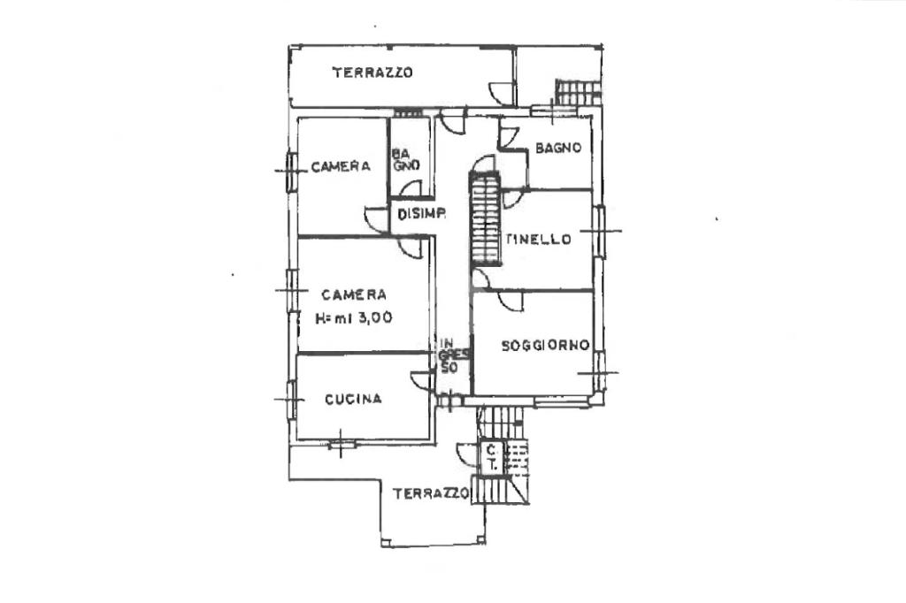 E' composta da un corridoio, cucina, tre camere letto di generose dimensioni, soggiorno, doppi servizi di cui uno completamente ristrutturato negli anni 2000 con box doccia e vasca. Un terrazzo di 25 mq circa ad oggi è adibito a seconda cucina con ampie vetrate, rendendo questo ambiente luminoso e gradevole.